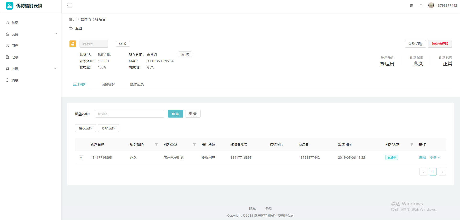 在【锁详情页】点击【蓝牙钥匙】,可以查看蓝牙钥匙列表,可对钥匙有效期进行编辑,并可进行相应的授权/取消授权,冻结/取消冻结、删除钥匙、查看操作记录等操作: