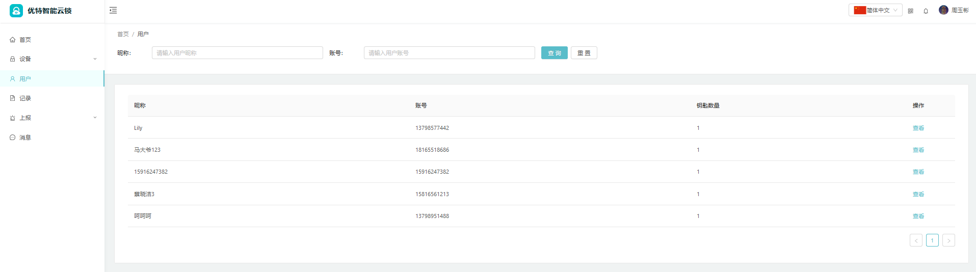 在【用户】模块内,您可以查看自己管理的锁设备所关联的锁用户,并且可以在用户列表内点击【查看】按钮,查看该用户所拥有的钥匙列表,可以对这些钥匙进行修改或删除,或者查看钥匙的操作记录等操作: